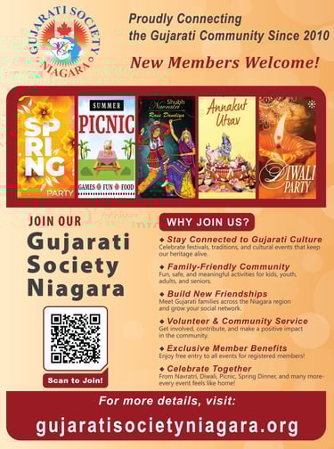 Gujarati Society Niagara is a cultural and educational non-profit organization based in Niagara Falls, Ontario. It is one of the largest cultural organizations in the Sothern Ontario , with thousands of Gujarati-speaking members and supporters. The framework of the Samaj was set in 2010; it has since grown to one of the most active Indian organizations in the Canada, holding many exciting cultural and recreational events that bring uncountable Gujarati community together.